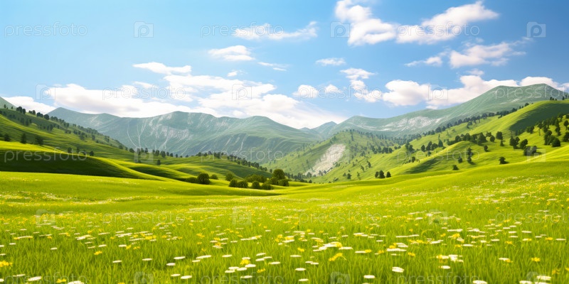 Панорамный вид на зеленые цветущие поля в горах