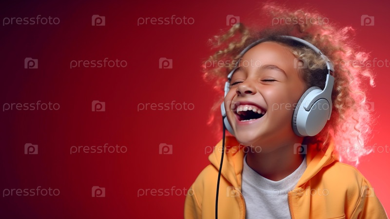Счастливая, эмоциональная девушка в наушниках на красном фоне, студийное освещение, копирование пространства