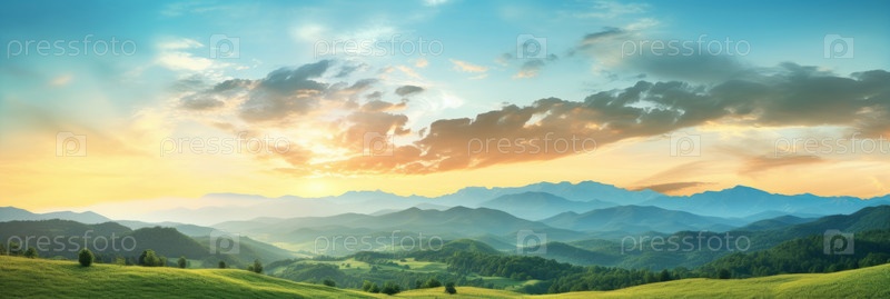 Панорамный вид на горы и зеленые луга на рассвете. Большой баннер. Пейзажный фон