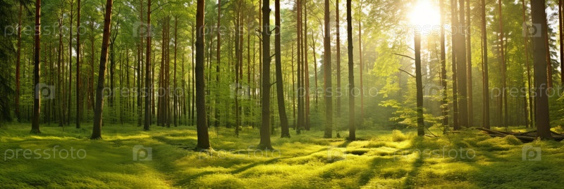Природный фон с красивым зеленым сосновым лесом с солнечным светом, сияющим сквозь деревья, солнечные лучи. Баннер, пространство для копирования