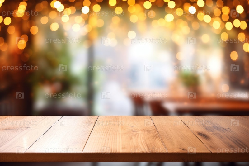 Пустая текстурированная деревянная столешница на фоне уютного интерьера кафе размыта золотыми огнями в боке. Мокап, копирование пространства, неглубокая глубина резкости, выборочный фокус