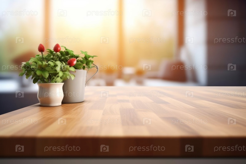 Деревянная столешница с комнатным растением на фоне кухонного интерьера с большим окном в размытом боке, макет, копирование пространства, неглубокая глубина резкости, избирательная фокусировка