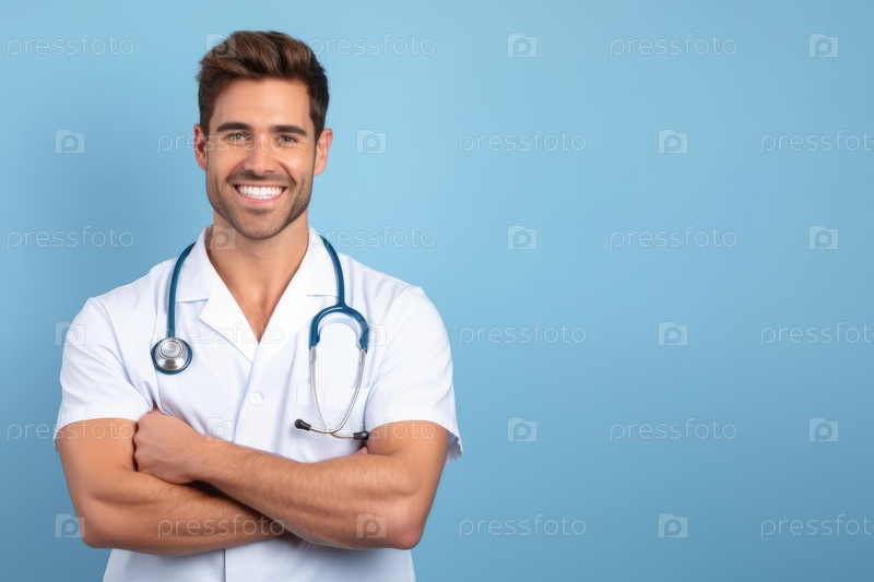 Портрет молодого счастливого, довольно улыбающегося медицинского работника, счастливого уверенного в себе позитивного стояния на фоне сплошного светло-голубого фона, скрещенных рук. Копировать пространство
