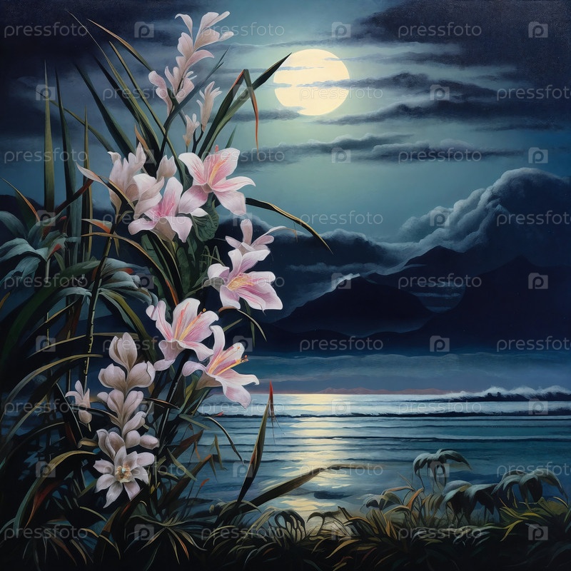 Иллюстрация полной луны ярко поднимается над морем. Генерирующий ИИ