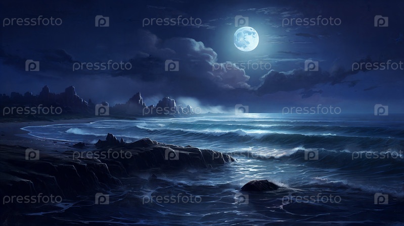 Иллюстрация полной луны ярко поднимается над морем. Панорама. Генерирующий ИИ