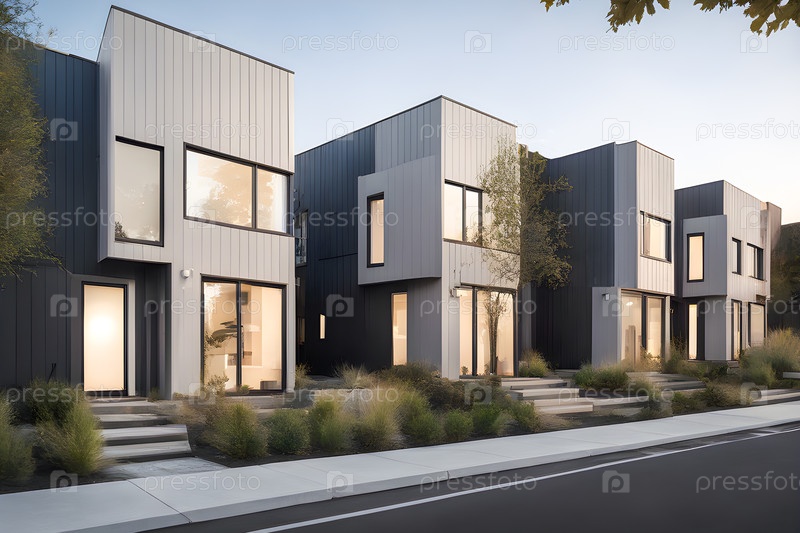 Вид на современные модульные частные таунхаусы. Жилая архитектура снаружи