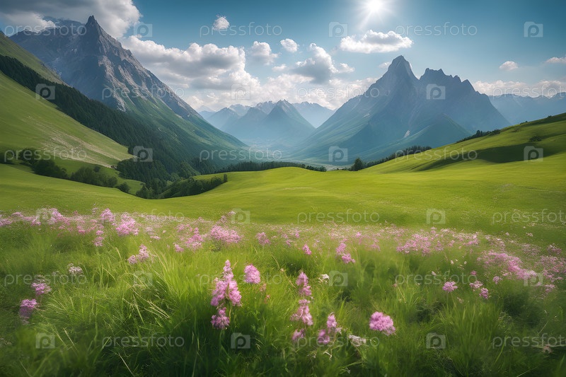 Красивый, захватывающий пейзаж с горами и цветущими зелеными лугами