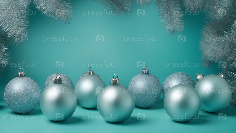 Бирюзовые шарики рождественской елки аккуратно расположены на равном расстоянии друг от друга на бирюзовом фоне, украшении (копировальное пространство)