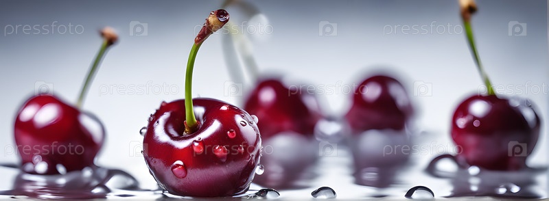 Закрыть вид на вишни с каплями воды, баннер, фон, неглубокая глубина резкости, селективный фокус, макро