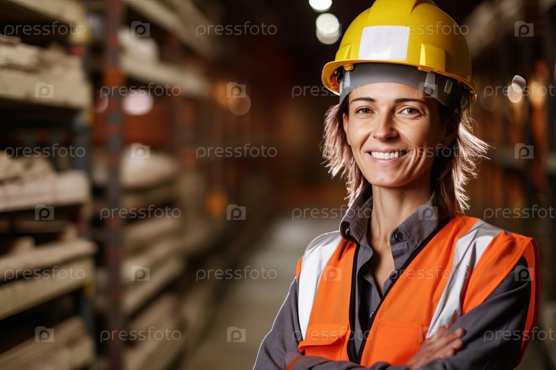 Портрет красивой взрослой работницы в жесткой шляпе и защитном жилете, на фоне склада в размытом, неглубоком поле