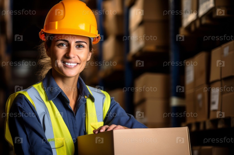 Портрет красивой женщины-работницы в твердой шляпе и жилете безопасности, держащей картонную коробку, на фоне склада в размытом, неглубоком поле