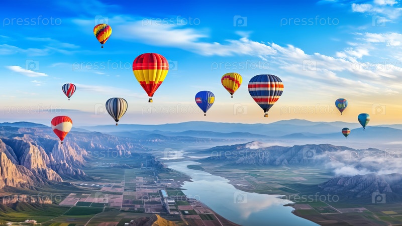 Вид с воздуха на множество красочных воздушных шаров, летящих над горами и реками, на фоне заката неба