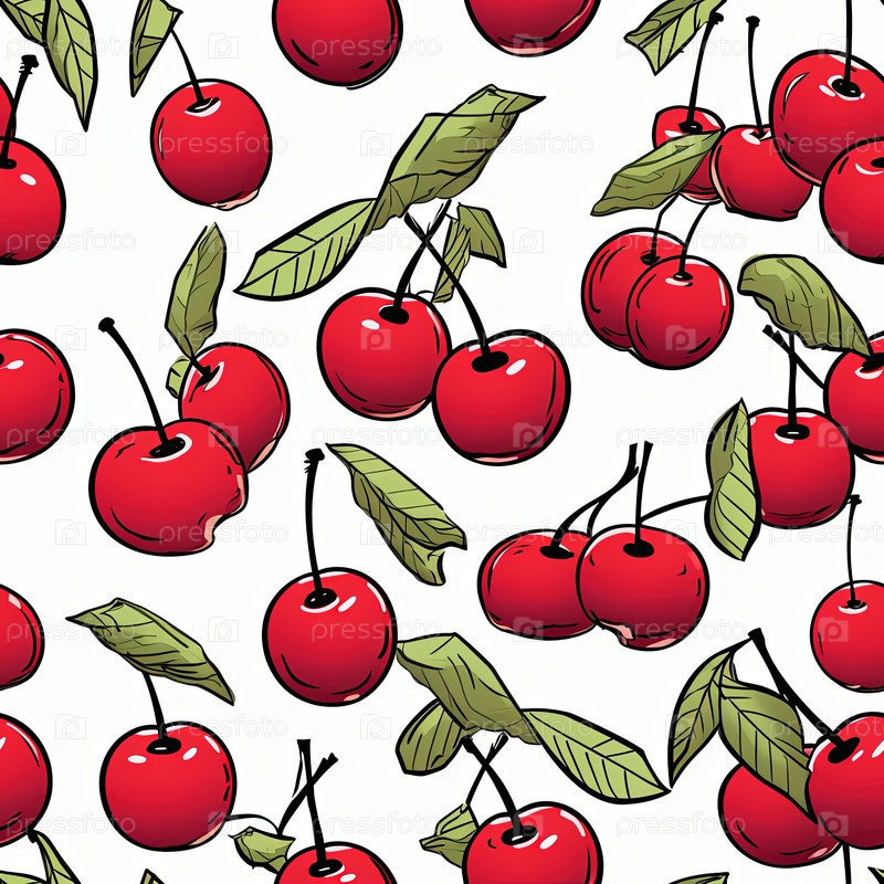Бесшовный узор вишни в графическом стиле, на белом фоне