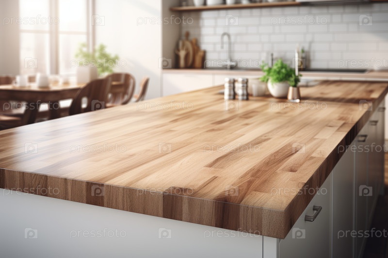 Современная кухня с пустым деревянным столом, на размытом фоне. Неглубокая глубина резкости, выборочная фокусировка, макет для монтажа текста или продукта, копирование пространства