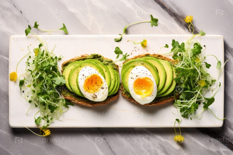 Вид сверху на тост из авокадо с идеально нарезанными авокадо, яйцами и микрозеленью, элегантно представленными на мраморной тарелке. Плоский мир