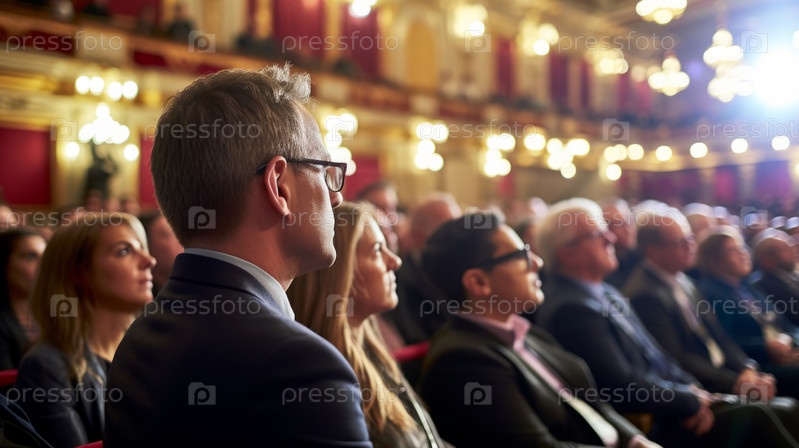 Вид на полный зал с аудиторией. Деловые люди на конференции. Избирательный фокус, неглубокая глубина резкости