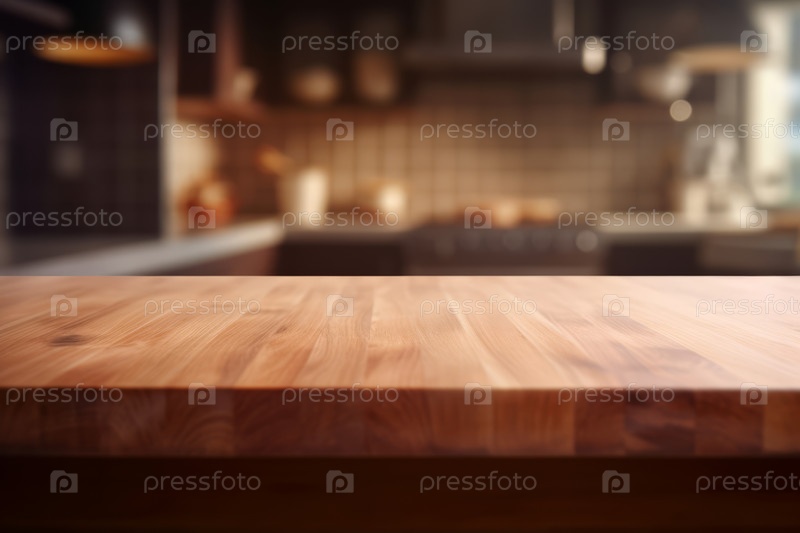 Современная кухня с пустым деревянным столом, на размытом фоне. Неглубокая глубина резкости, выборочная фокусировка, макет для монтажа текста или продукта, копирование пространства
