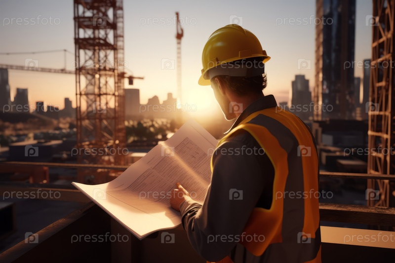 Рабочий на строительной площадке держит документы на фоне заката, силуэтного освещения. Неглубокая глубина резкости, селективный фокус