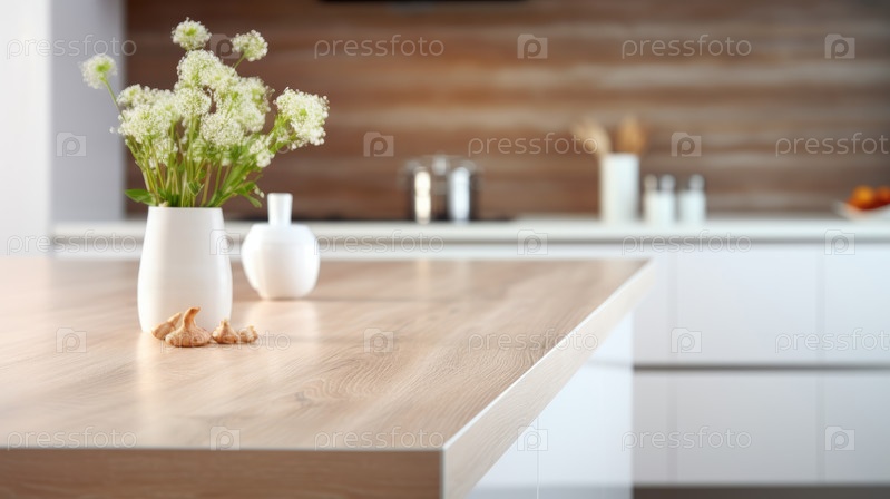 Современная кухня с пустым деревянным столом, на размытом фоне. Неглубокая глубина резкости, выборочная фокусировка, макет для монтажа текста или продукта, копирование пространства