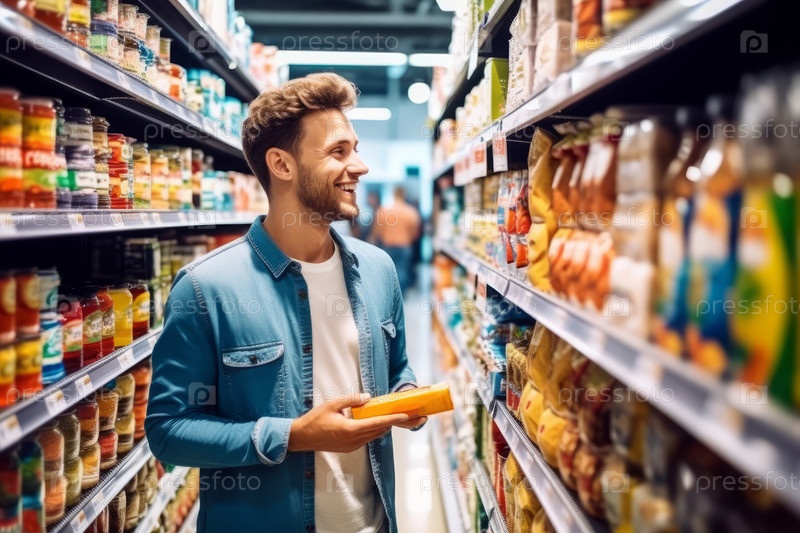 Веселый покупатель между рядами полок в супермаркете покупает продукцию. Избирательный фокус, неглубокая глубина резкости, размытый фон