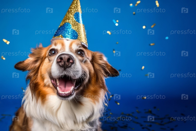 Закройте портрет счастливой милой собаки-корги в партийной шляпе, окруженной падающим конфетти, сплошным синим фоном. Копировать пространство