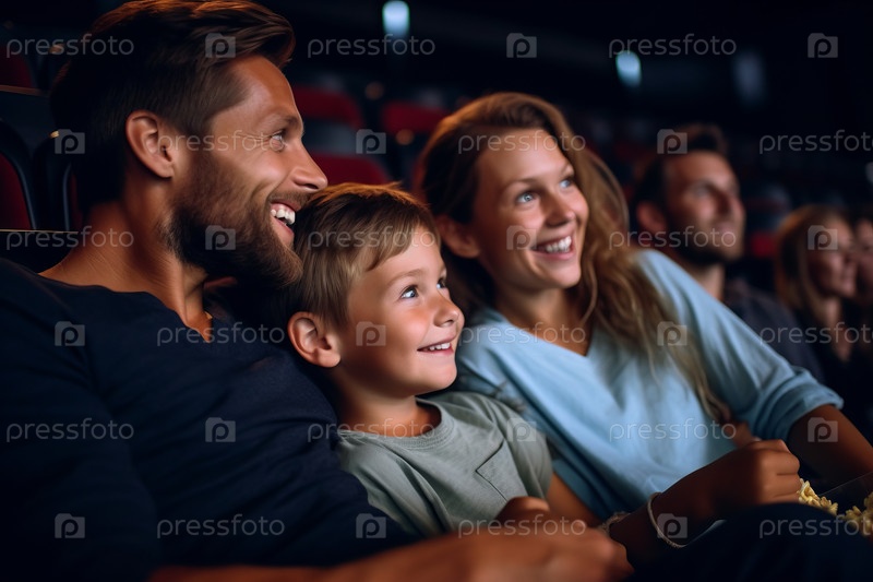 Закрытый вид молодой радостной семьи с ребенком в кино, просмотр фильма