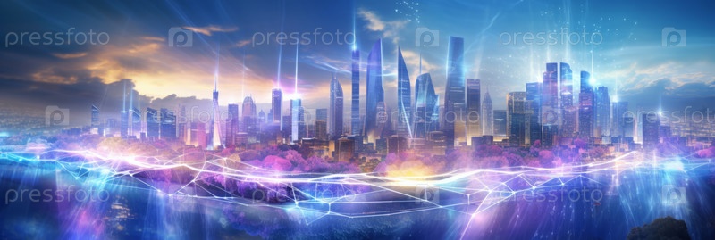 Абстрактный световой поток через город с градиентным и эстетическим замысловатым дизайном освещения, концепция умного города и технологии подключения больших данных