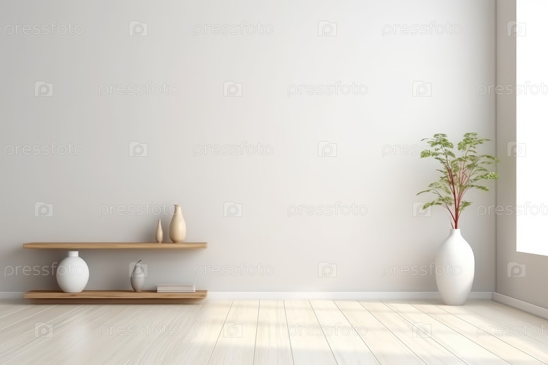 Яркая гостиная в минималистичном дизайне интерьера с комнатными растениями в горшке, полки с вазами, пустое пространство на стене для макета, копирование пространства