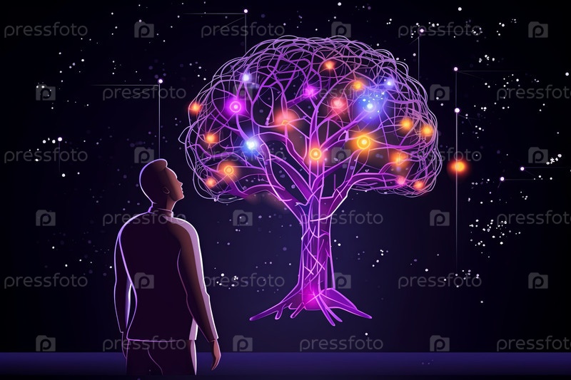 Концепция искусственного интеллекта использует аналитику, автоматизацию и автономный мозг через дерево. Управление большими данными