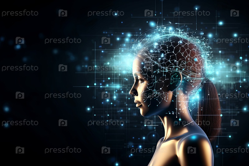 Концепция искусственного интеллекта использует аналитику, автоматизацию и автономный мозг. Портрет женщины-робота, управление большими данными