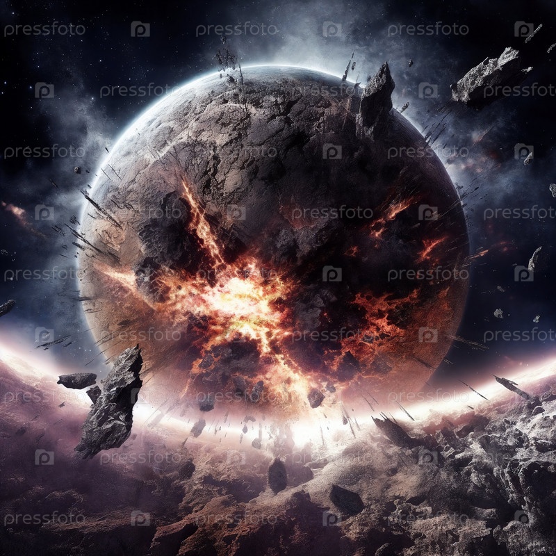 Фантастическая планета с астероидом, воздействующим на поверхность на переднем плане, ночное небо со звездами и планетами на заднем плане. ИИ генеративный