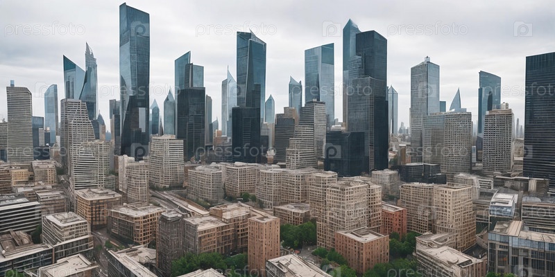 Архитектурные детали, от гладких современных небоскребов до старых и выветрившихся конструкций. Панорама. Генерирующий ИИ