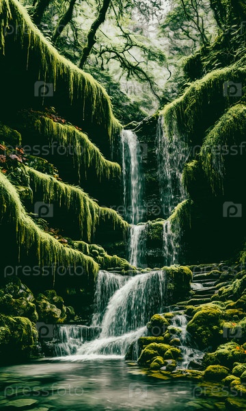 Зачарованный водопад. Водопад каскадирует вниз по покрытым мхом скалам, открывая секретный грот за его завесой. Кристалло-чистая вода сверкает намеками на магию, а по берегам цветут красочные цветы