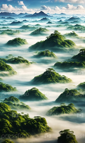 Плавающие острова. Над морем облаков острова дрейфуют, как мечты. Каждый из них представляет собой миниатюрный мир, пышные леса, водопады и плавучие сады. Небо затаивает дыхание, и радуга плетется сквозь туман