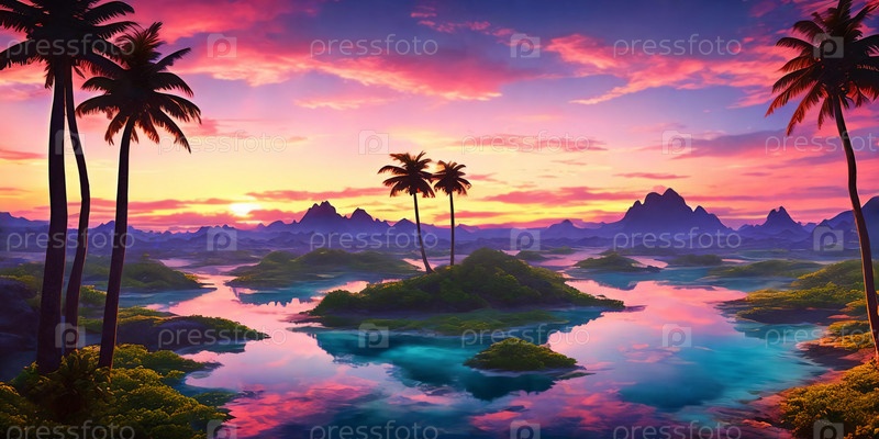 Закат рисует небо в оттенках розового и синего над спокойным морем, пальмами, выстилающими берег на райской фантазийной планете