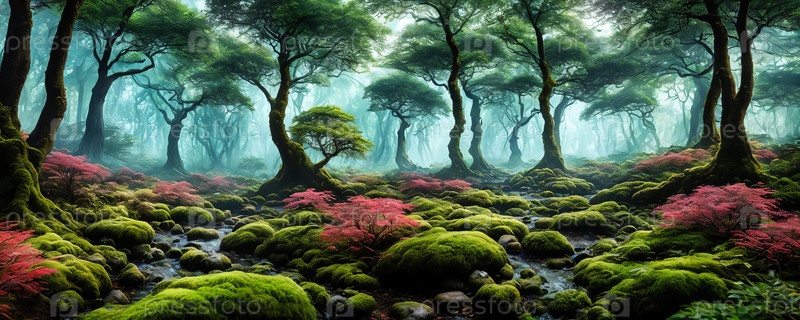 Зачарованный лес. Потусторонний лесной ландшафт с величественными древними деревьями. Генерирующий ИИ