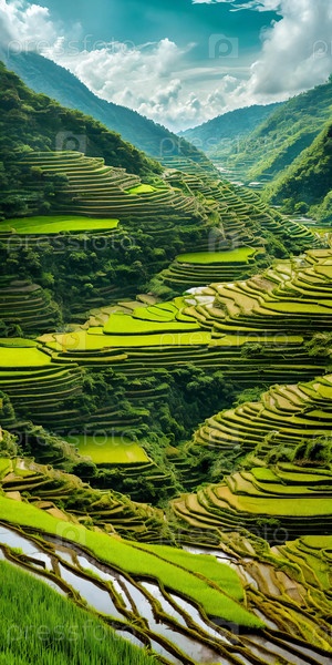 Зеленые рисовые террасы греются на закате