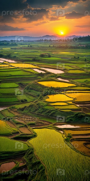 Зеленые рисовые террасы греются на закате, природа Шедевр в теплых тонах