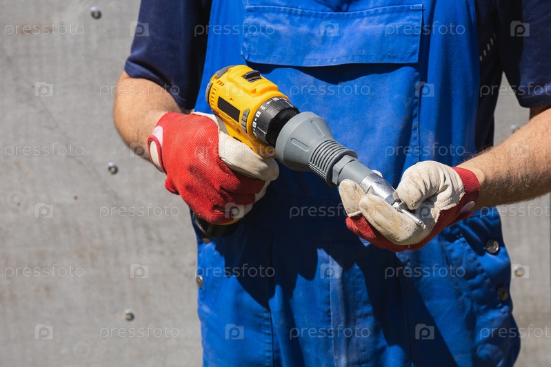 Рабочий в синем комбинезоне держит электрическую отвертку с заклепкой и выхлопной заклепкой против шиферной стены