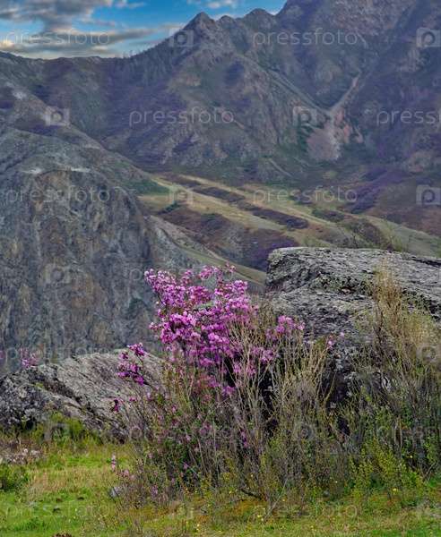 Россия. Горный Алтай. Цветущий куст рододендрона ледебура (маральника) на склонах гор вдоль Чуйского тракта недалеко от села Купчеген