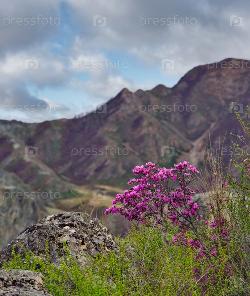 Россия. Горный Алтай. Цветущий куст рододендрона ледебура (маральника) на склонах гор вдоль Чуйского тракта недалеко от села Купчеген