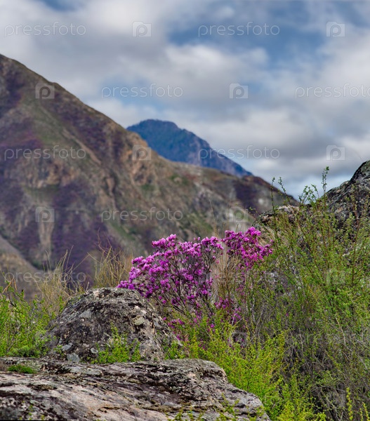 Россия. Горный Алтай. Цветущий куст рододендрона ледебура (маральника) на склонах гор вдоль Чуйского тракта недалеко от села Купчеген