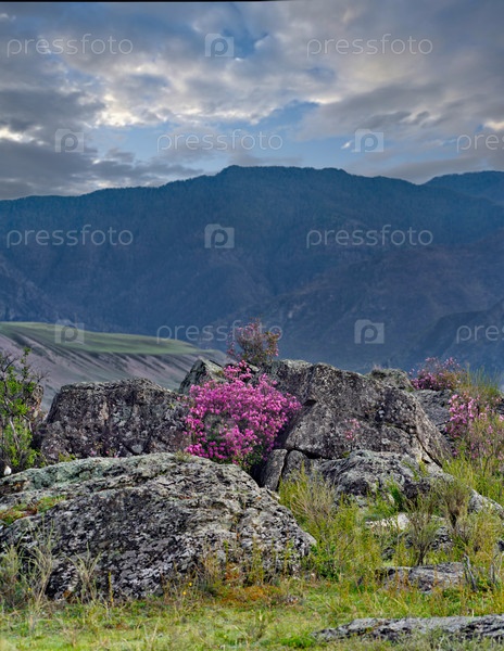 Россия. Горный Алтай. Цветущий куст рододендрона ледебура (маральника) на склонах гор вдоль Чуйского тракта недалеко от села Купчеген