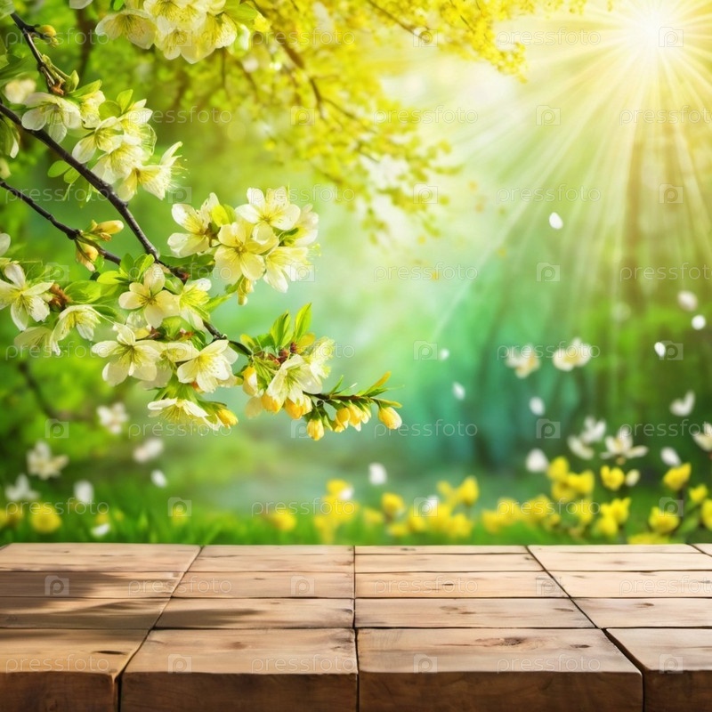 Деревянный стол сидит перед размытым фоном весеннего сада. Желтые цветы на ветке достигают солнца, которое светит сквозь листву. Копирование пространства для демонстрации продукции. ИИ