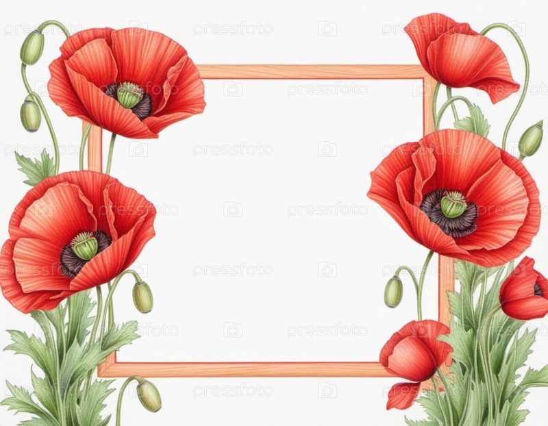 Красные маки с зелеными листьями и стеблями. Маки изображены на различных стадиях цветения, некоторые полностью открыты, а другие в зародыше. Мягкая спина, создающая деликатное и романтическое чувство