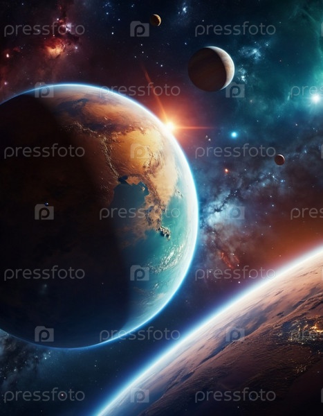 Планетарная система с несколькими планетами, большой ярко окрашенный газовый гигант и скалистая планета. Яркие звезды и обширное пространство темного пространства с галактикой на заднем плане. Космические пространства. Космонавтика. ИИ