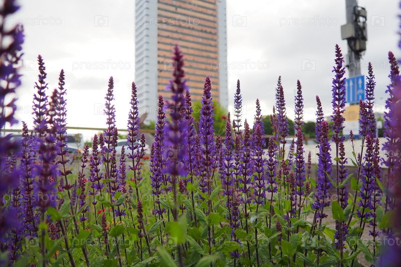 Утро в Будапеште, Венгрия. Трава рядом с дорогой. Машины едут быстро. Сальвия крупный род многолетних травянистых растений, кустарников семейства Lamiaceae. Мудрый Салвия Пратенсис. Фиолетовые цветы