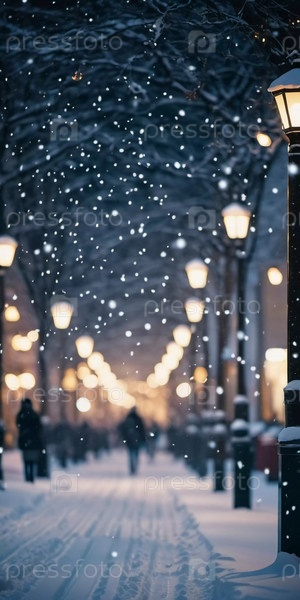 Зима приносит мягкий снегопад на городские улицы, где над головой висят красочные огни, создавая теплую и праздничную атмосферу. Эффект боке от огней добавляет причудливого прикосновения, подчеркивая радость сезона