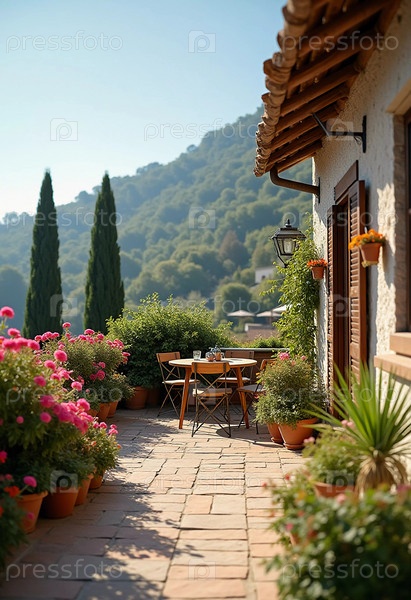 Солнечная терраса, окруженная красочными цветами, приглашает на отдых, предлагая захватывающий вид и уютное место со столовыми стульями. Терраса украшена цветущими цветами и живописными горами. Генеративный ИИ