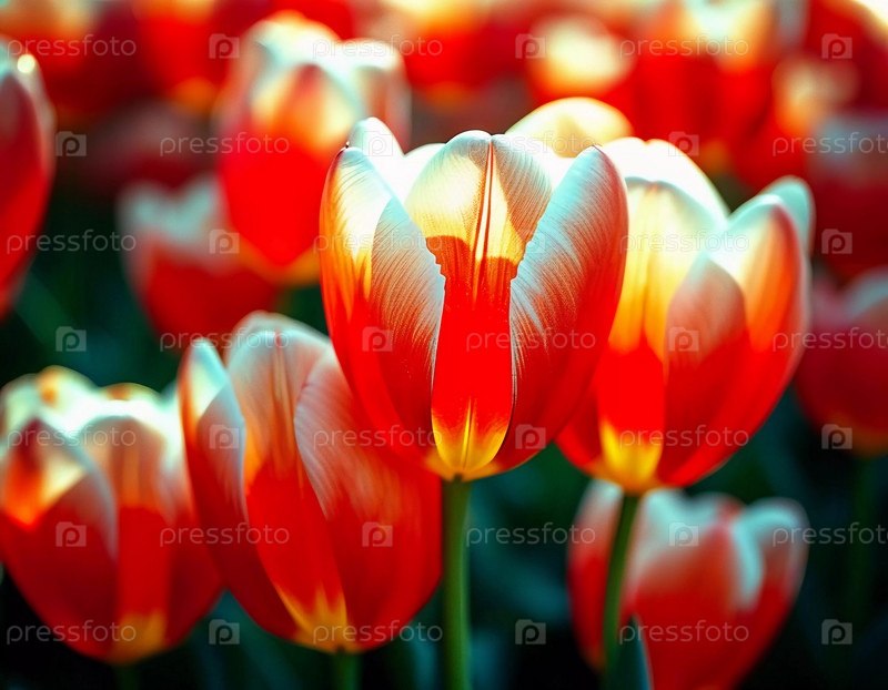 Поле тюльпанов греется в золотом солнечном свете сумерек, демонстрируя яркие оттенки оранжевого и желтого, когда цветы широко открываются. Сцена отражает суть весенней красоты. Генерирующий ИИ